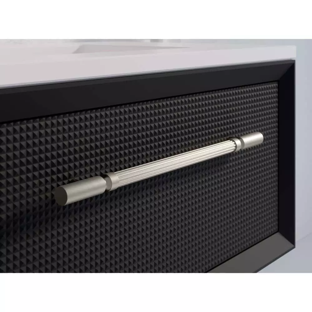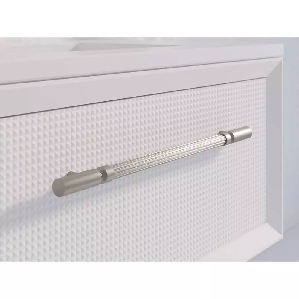 Rounded edges, ribbed and smooth textures and inset design details combine within this functional, baton-style hardware accent. Juxtaposed against the square-textured Enivo drawer front and sleek rectangular silhouette, the rounded metal drawer pull adds unique visual interest and ornamental sophistication. Available in bold contrasting colors or more subdued finishes to perfectly suit your personal style.