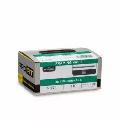 Common framing nails are used for general construction where a smooth shank for driving ease is desired. Rely on PRO-FIT common nails to build walls, roofs, apply sheathing, sub-flooring, and for just about any interior project where you use construction lumber. PRO-FIT common nails are fast to drive with a diamond point and a smooth shank. The head design is 3-4 times the size of the shank, providing easy connection and reliable holding power.
