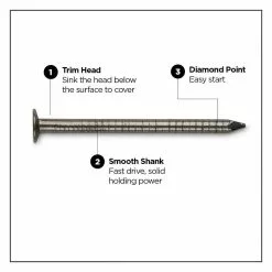- Shank Style: Rings keep the nail from backing out of the wood once driven. They offer superior holding power as the wood fills in the crevasse of the rings, creating friction to keep the nail in place over time.