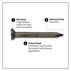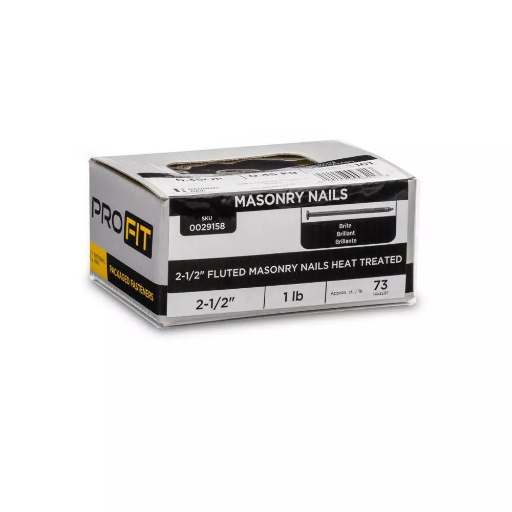 PRO-FIT fluted masonry nails secure wood into concrete or mortar and are commonly used to attach furring strips on walls or floors. This nail features a fluted shank that runs the shaft’s length, allowing for a strong hold while minimizing the cracks in these rigid substrates. PRO-FIT fluted masonry nails are brite coated for interior use and conform to ASTM A1667.