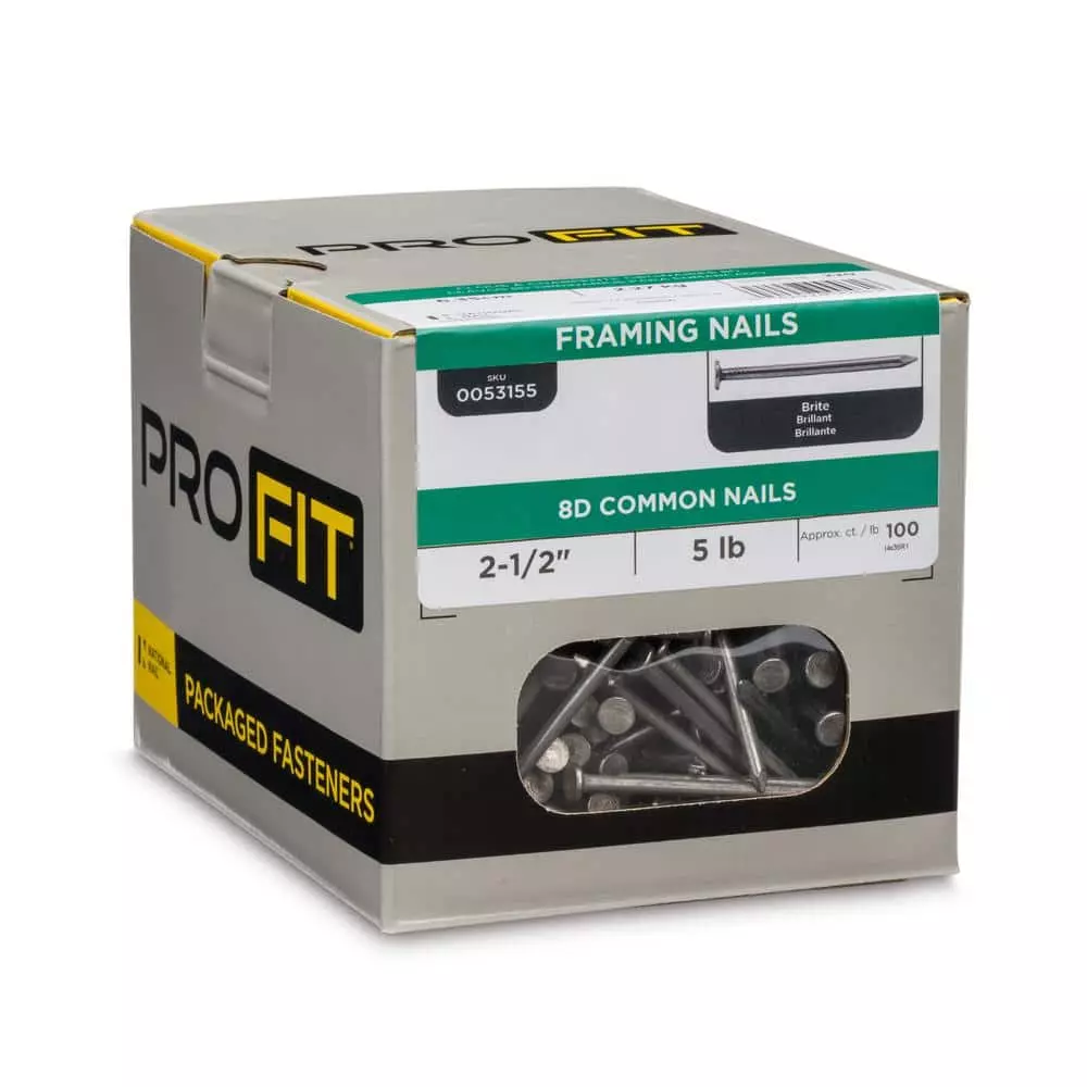 Common framing nails are used for general construction where a smooth shank for driving ease is desired. Rely on PRO-FIT common nails to build walls, roofs, apply sheathing, sub-flooring, and for just about any interior project where you use construction lumber. PRO-FIT common nails are fast to drive with a diamond point and a smooth shank. The head design is 3-4 times the size of the shank, providing easy connection and reliable holding power.
