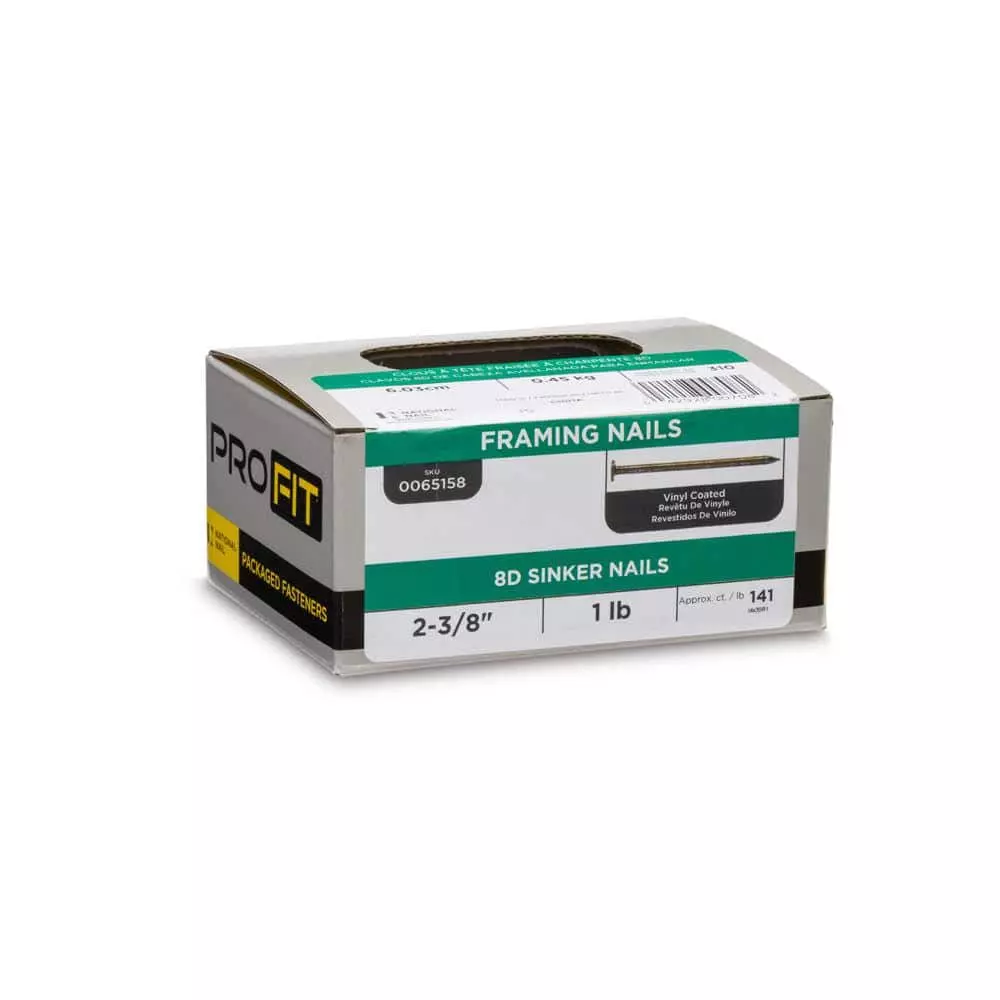 PRO-FIT sinker nails are for general interior construction, carpentry, and framing projects where construction lumber is being used. They are vinyl coated, which provides lubrication to improve driving speed and holding power. The flat countersunk head features a checkered pattern that keeps the hammer from slipping during the strike, providing a sure connection and easy drive.