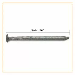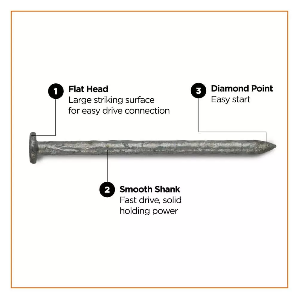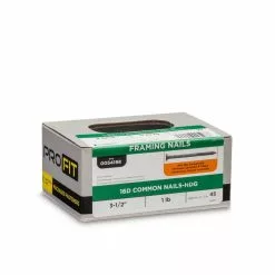 Exterior common nails are used for framing, carpentry, and general construction where a smooth shank for driving ease is desired. PRO-FIT common nails are hot dipped galvanized, conforming to ASTM A153 for corrosion resistance in outdoor projects. Rely on PRO-FIT common nails for just about any exterior project where you use construction lumber. PRO-FIT common nails are fast to drive with a diamond point and a smooth shank. The head design is 3-4 times the size of the shank, providing easy connection and reliable holding power.