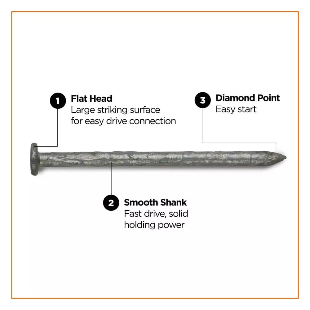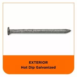 Exterior common nails are used for framing, carpentry, and general construction where a smooth shank for driving ease is desired. PRO-FIT common nails are hot dipped galvanized, conforming to ASTM A153 for corrosion resistance in outdoor projects. Rely on PRO-FIT common nails for just about any exterior project where you use construction lumber. PRO-FIT common nails are fast to drive with a diamond point and a smooth shank. The head design is 3-4 times the size of the shank, providing easy connection and reliable holding power.