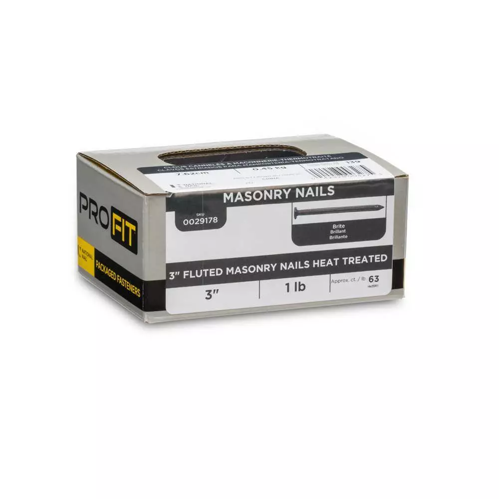 PRO-FIT fluted masonry nails secure wood into concrete or mortar and are commonly used to attach furring strips on walls or floors. This nail features a fluted shank that runs the shaft’s length, allowing for a strong hold while minimizing the cracks in these rigid substrates. PRO-FIT fluted masonry nails are brite coated for interior use and conform to ASTM A1667.