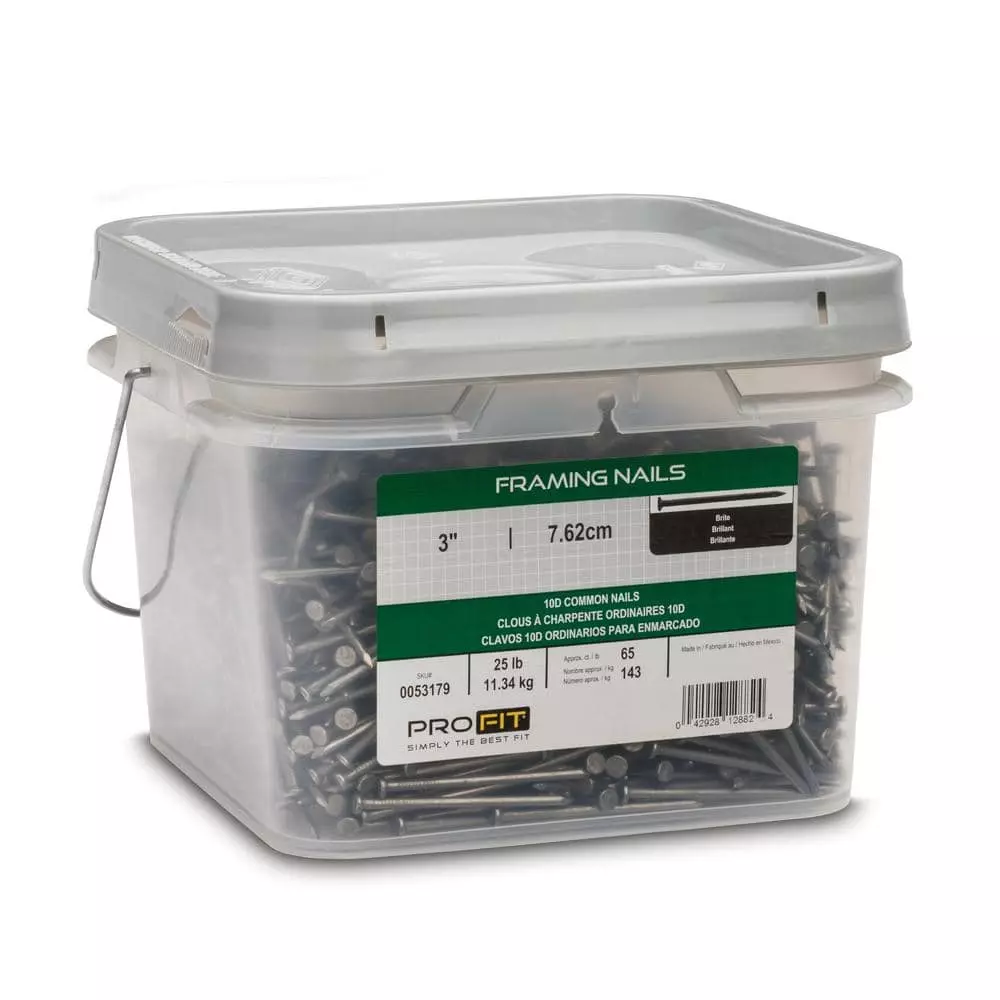 Common framing nails are used for general construction where a smooth shank for driving ease is desired. Rely on PRO-FIT common nails to build walls, roofs, apply sheathing, sub-flooring, and for just about any interior project where you use construction lumber. PRO-FIT common nails are fast to drive with a diamond point and a smooth shank. The head design is 3-4 times the size of the shank, providing easy connection and reliable holding power.